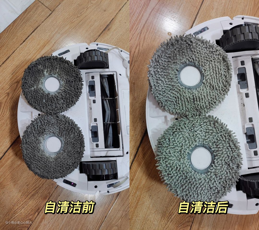可以看到相比一个边刷,两个边刷同时运转 ,固体物都跑不了,半干的酱油一遍就给搓没了,双旋转加压拖布不是盖的,跟我跪地上手搓没差。