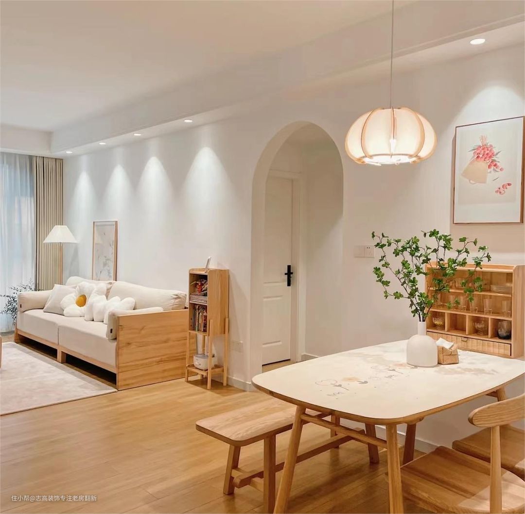 原木风最好的地面是通铺木地板,其次是地板砖,但是客厅通铺木地板后期保养很麻烦。我个人建议是通铺地板砖,清洁卫生方便。奶油原木可以通铺素色的奶油砖,极简原木的工艺要按照极简去处理,微水泥素色砖、木地板也可以搭配使用。