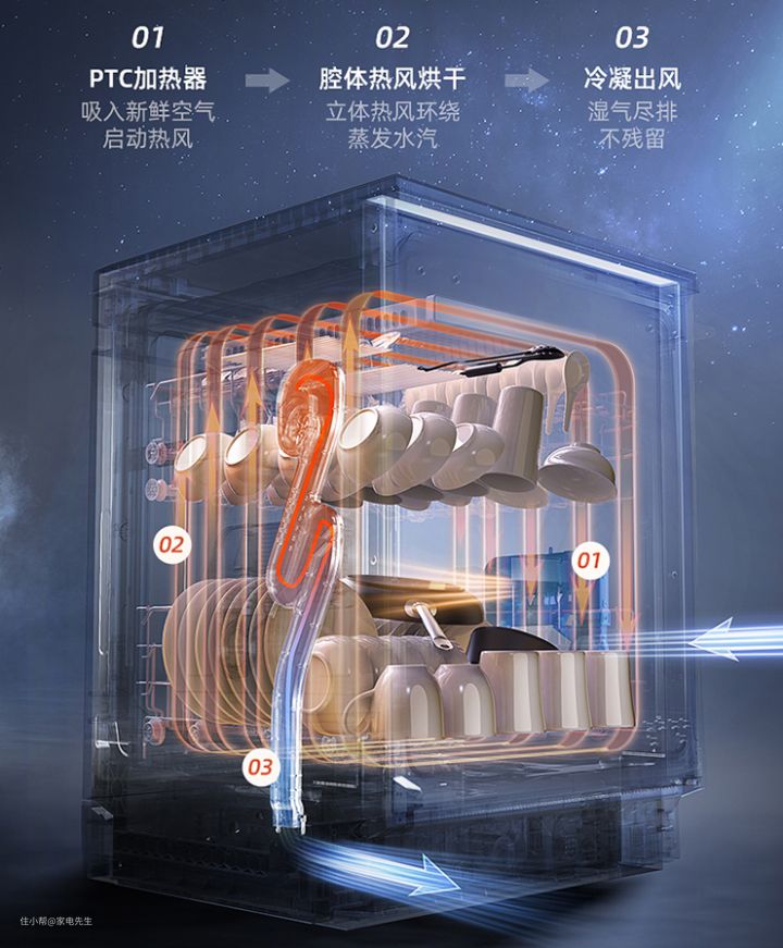 烘干效果主要靠烘干方式,分为五种:余温、热交换、热风、自动开门和沸石烘干。
