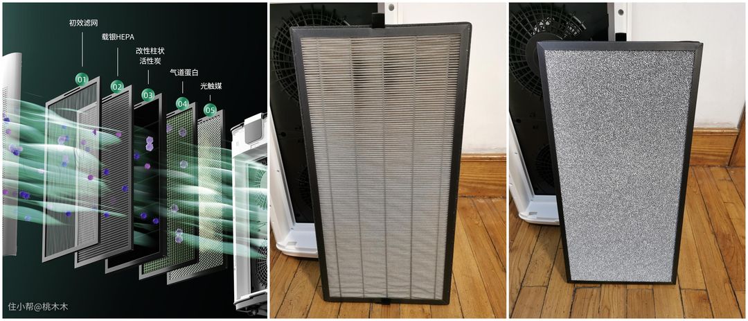 - 第一层的初效滤网+第二层的高效滤网是为颗粒物准备的,尤其是高效滤网使用了静电驻极功能,这对细小颗粒物的净化能力将会更高。