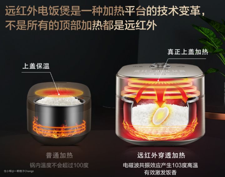 一般的电饭煲只有底部加热,锅盖用于保温。热量以水为介质,然后逐渐渗透到米饭内,锅内的温度不会超过100度,而且会有热损耗,无法令米饭香气激发出来,煮出来的饭也容易出现夹生饭。