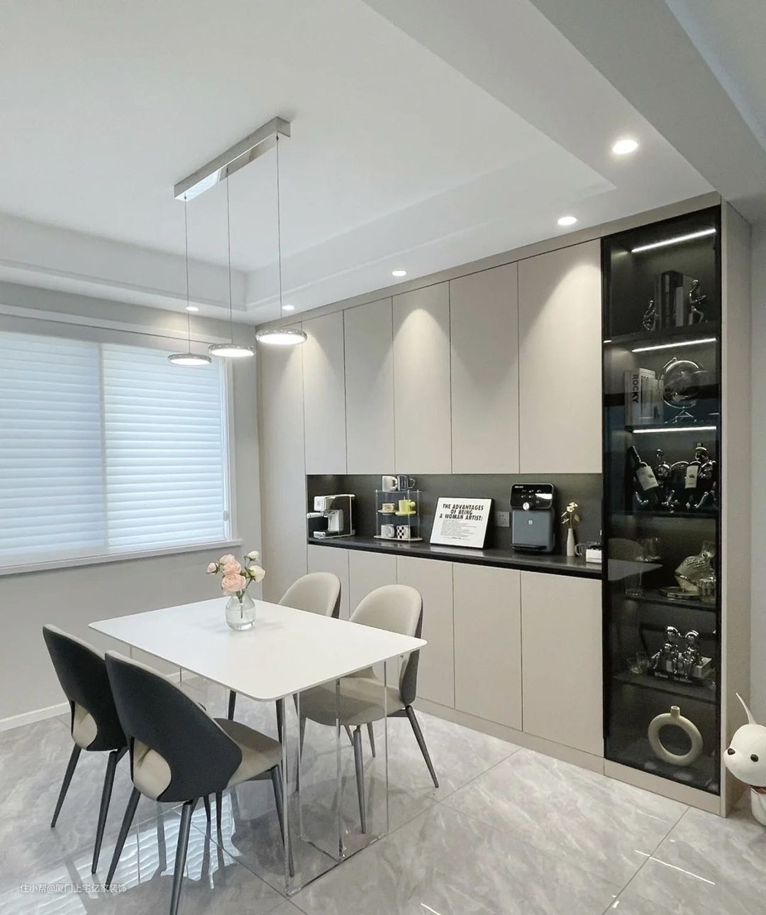 餐厅边柜跟餐桌的颜色一体,餐厅边柜可以让整个餐厅显得不那么单调,而且还可以作为收纳,也可以摆放一些花艺还可以当酒柜。