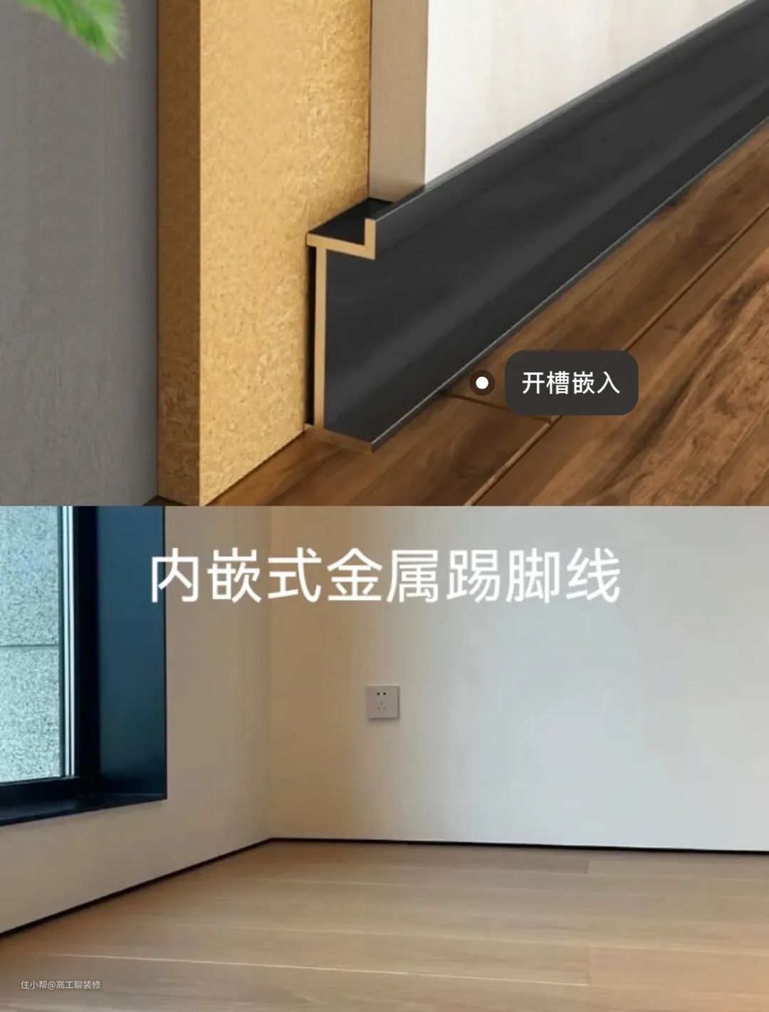 使用铝合金踢脚线提高档次,铝合金踢脚线适合极简装修风格,外观质感高雅、造型现代简约、装饰效果高,而且铝合金材质的踢脚线也很容易和墙面、地面百搭。