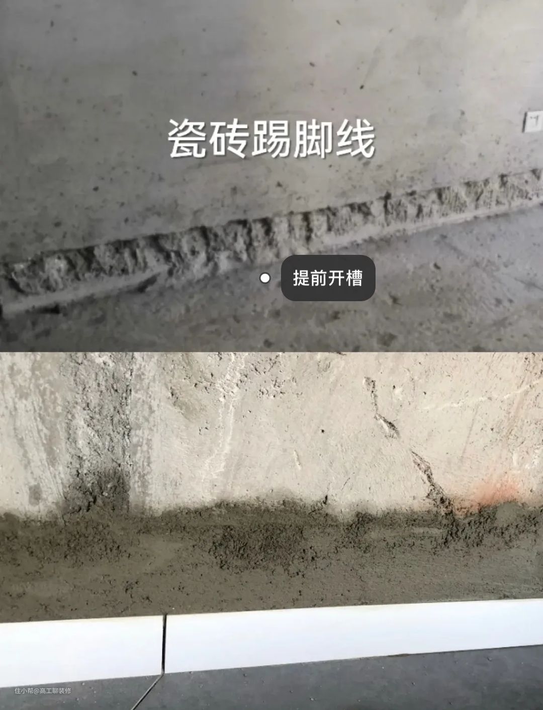 瓷砖踢脚线,大多数情况下是需要在水电阶段开好槽,贴瓷砖的时候,把踢脚线贴到开槽的位置就完事了。