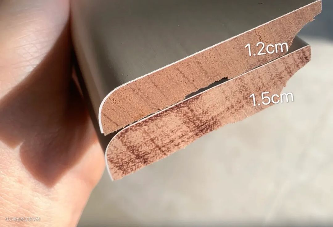 现在市面上踢脚线的厚度有1.2cm和1.5cm,厚度还是结合着门框的厚度来就没错。