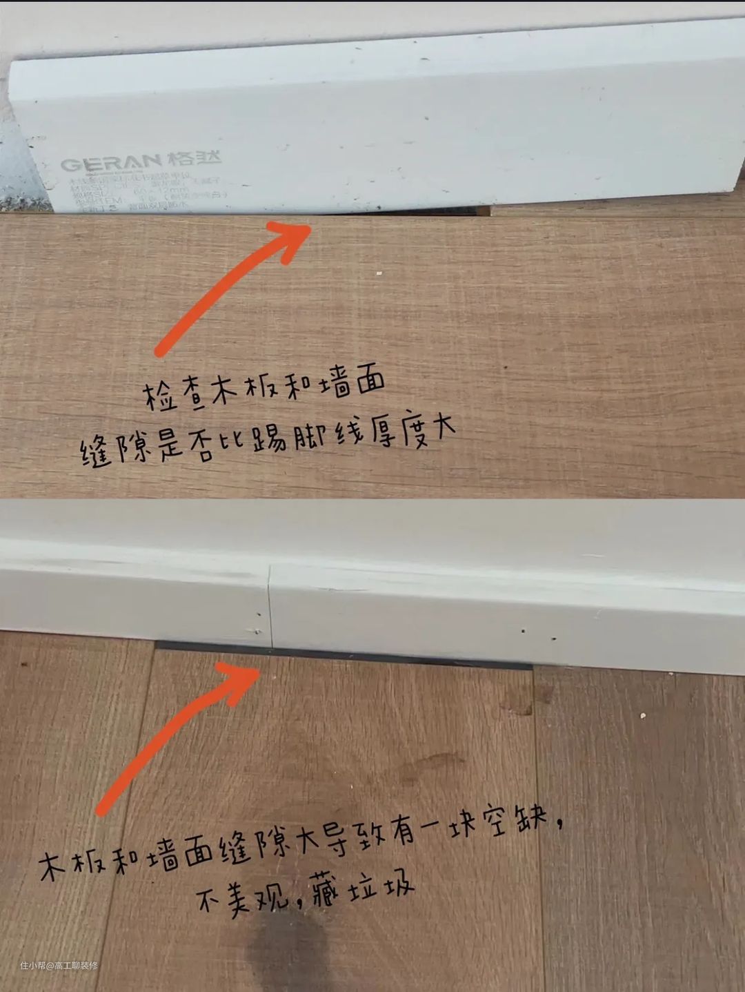 如果家里的地面铺贴了木地板,需要在安装踢脚线之前检查一下地板边缘处与墙的间隔,不要超过踢脚线的厚度,不然真的遮盖不住,会留下一个缝隙,建议安装踢脚线时现场盯工。