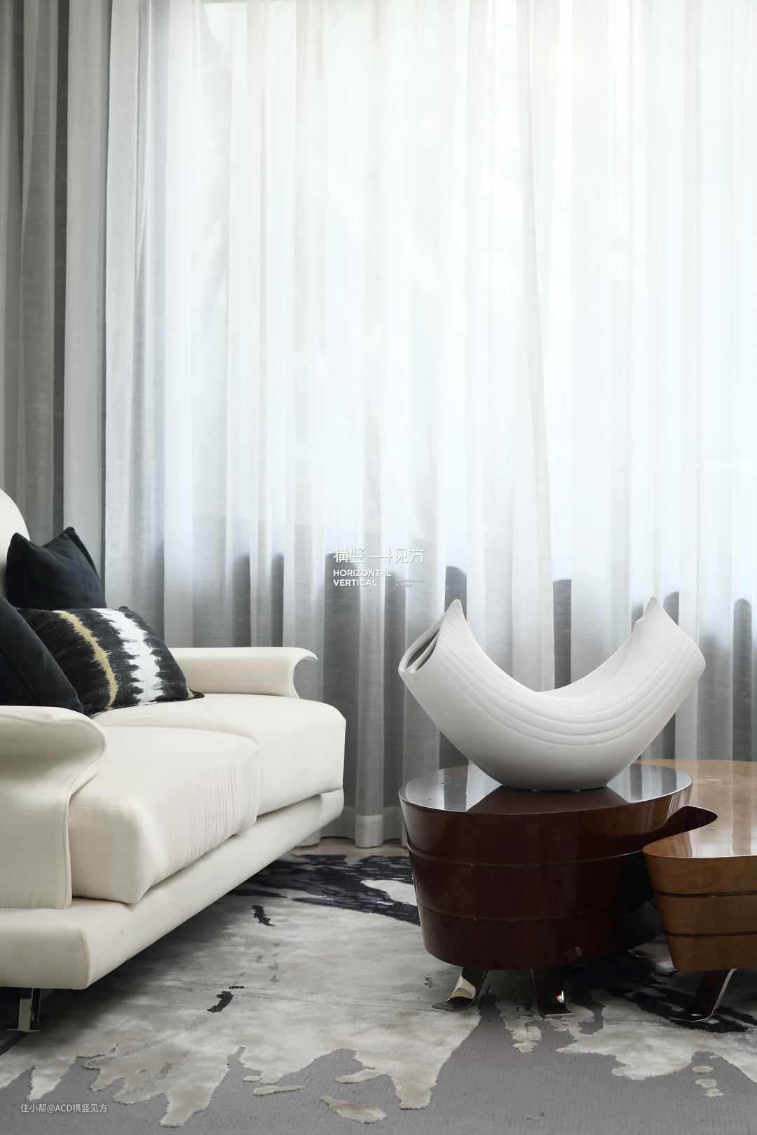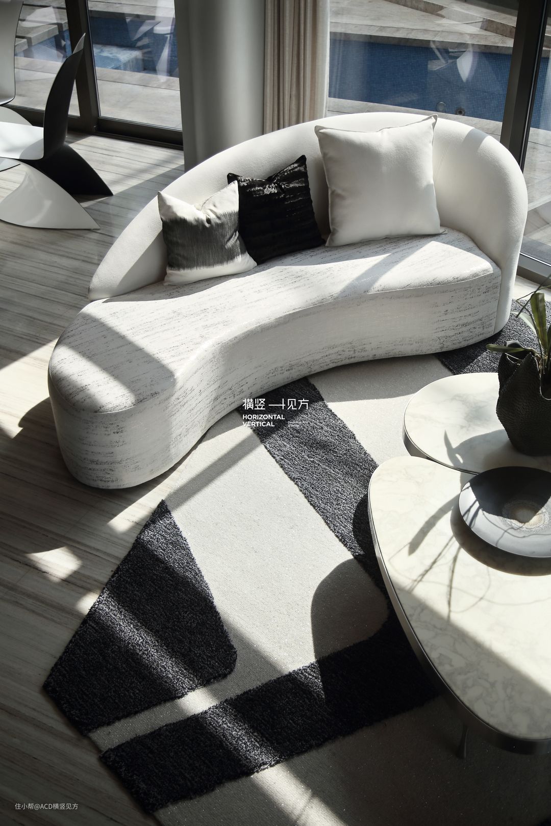 第四张地毯作用于一楼的客厅,这款尺寸为2627(长)x 2885(宽)mm的活动手織羊毛加丝地毯,黑白相间、不规则的外形现代感十足,选用羊毛加丝地毯的话,触感更加柔和舒适。两扇落地窗的设计,带来了充足的采光,整个客厅大气起来,亲朋好友们来此做客,能够感受到与自然融为一体的快乐。