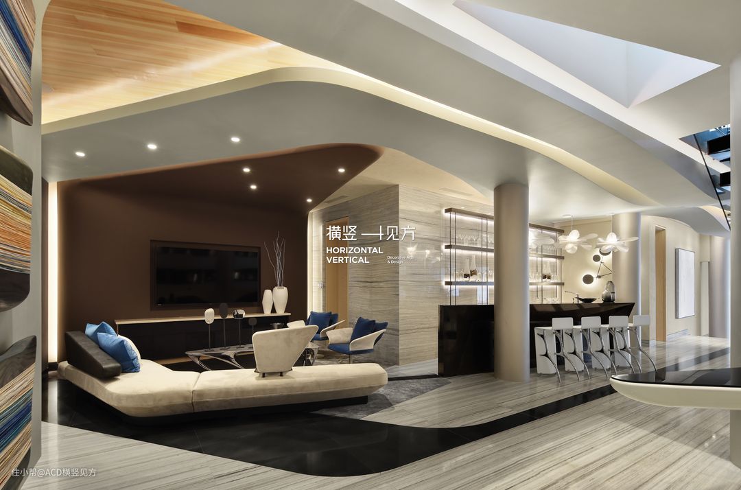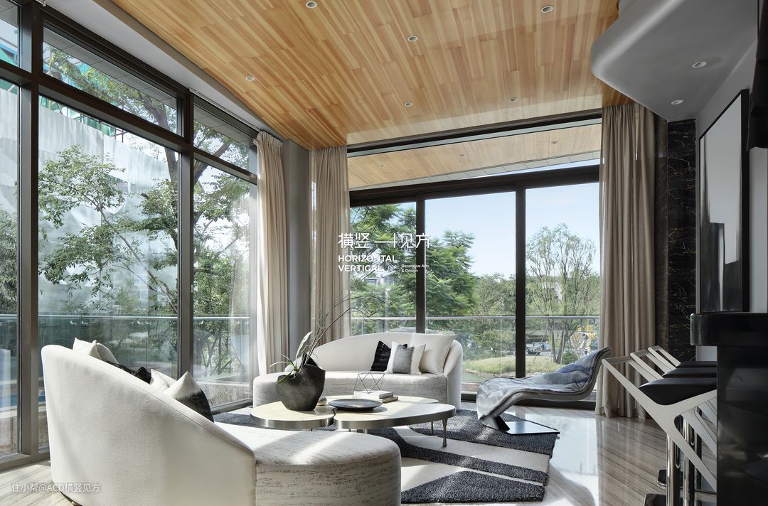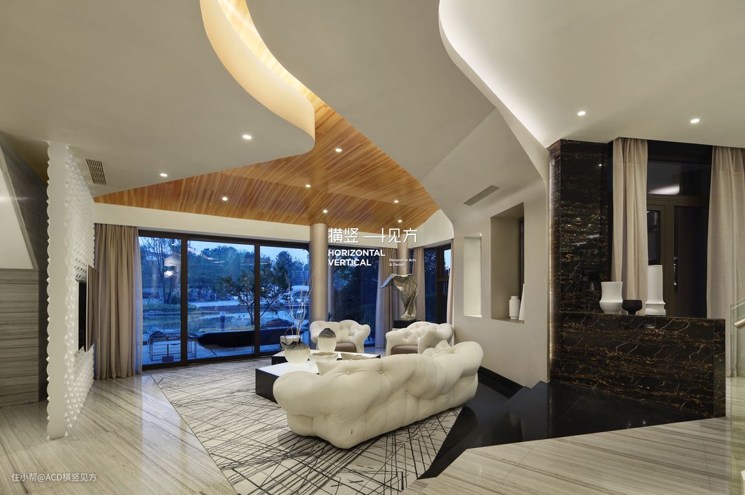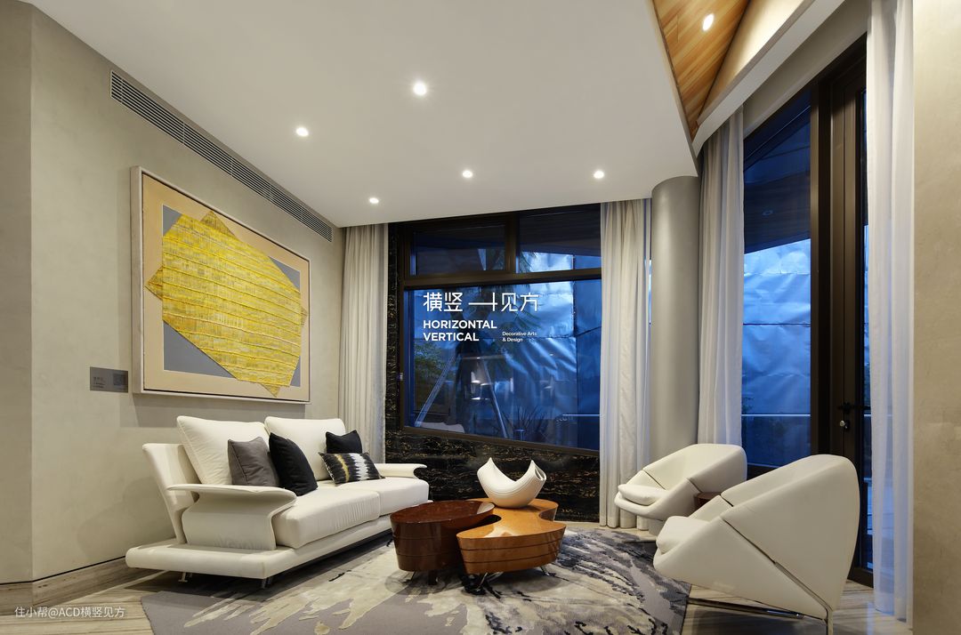 第三张活动手織羊毛加丝地毯,不大不小,作用于一层的休息厅刚刚好。根据整体现代风格的格调定制而成,搭配白色的沙发和座椅,正好减少了空间的单调性;搭配深浅木色的茶几,温润而不失质感;纱帘、挂画点缀,温馨而浪漫;中央空调的设计,更是营造了一个温馨舒适的休息区。
