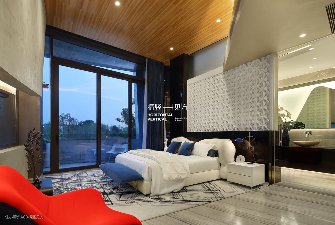 第七张地毯,作用于二楼的主卧,饰面为80% 纯紐西蘭羊毛,、20% 尼龙的材质,4055(长)x 3230(宽)mm大小的地毯很好的将床纳入其中,一直延伸至玻璃推拉门,其将卧室与阳台隔离,动线分明,一方面可以将窗外的美景尽收眼底,另一方面又可以在宽敞的室内获得满满的安全感。