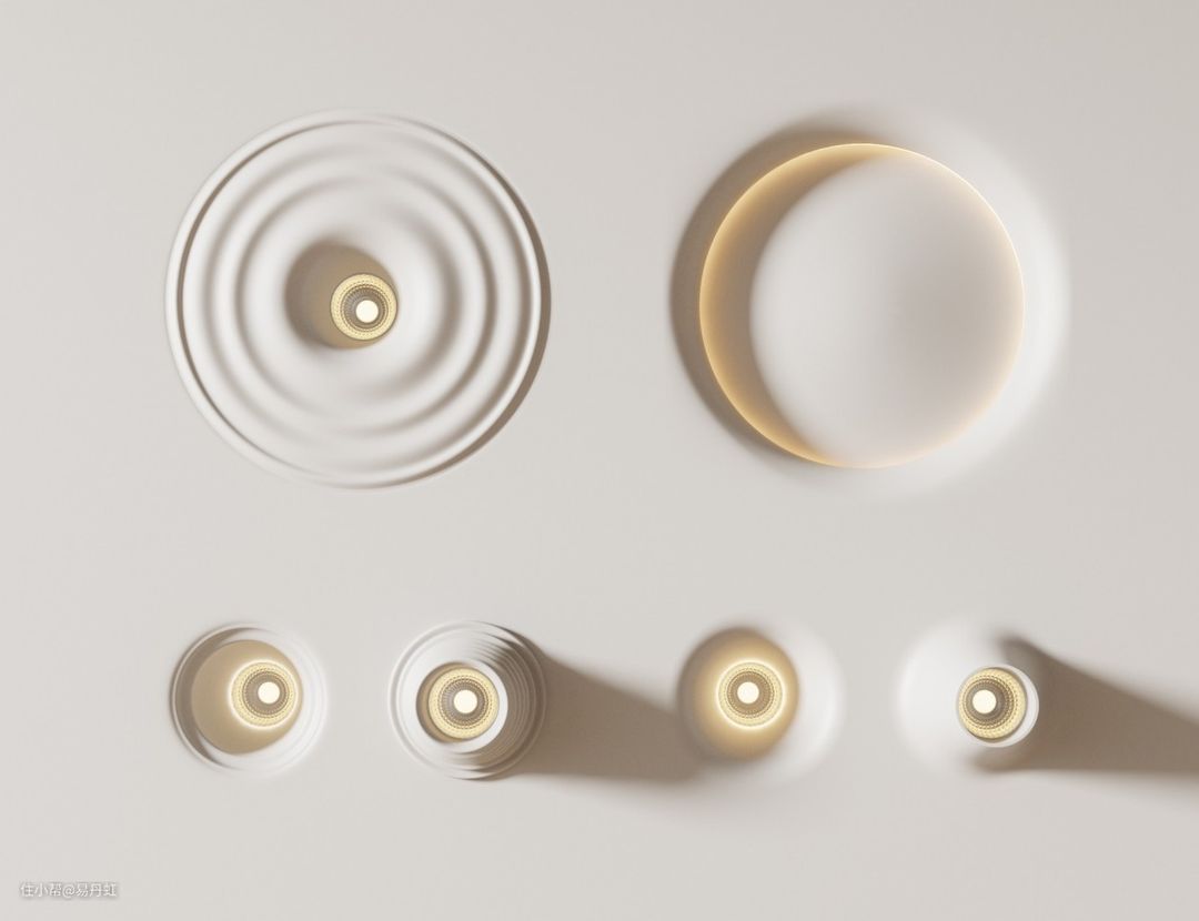 石膏灯,由石膏制作而成,与天花灯完美结合,形成如同月球表面坑洼的灯光效果,适用于无主灯设计。