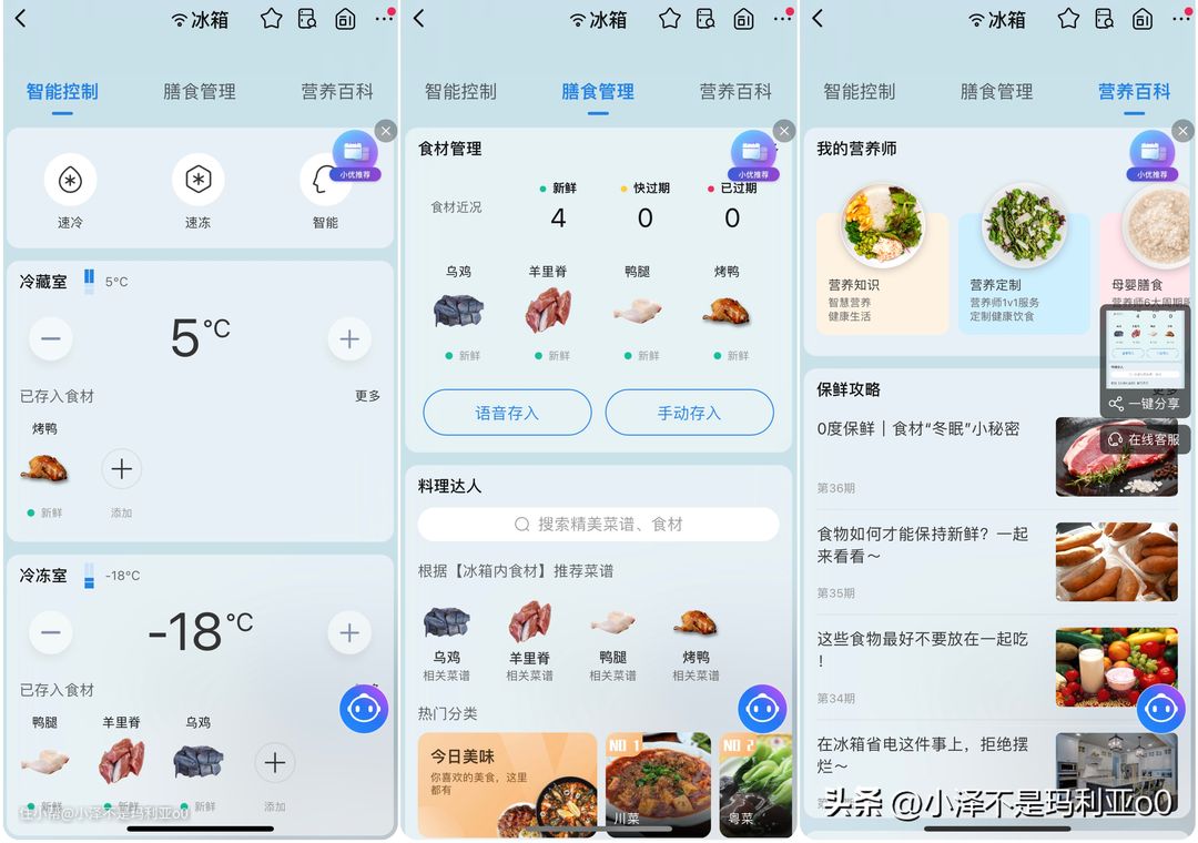 ▼最后再来说说这个海尔智家APP,虽然爸妈可能不怎么会用到,但我依然可以通过手机方便的帮他们远程调控温度,倘若你平时比较注重饮食管理的话,那么在APP中还能通过食材管理功能清晰的记录每种食材的购买时间,剩余数量,避免重复购买食材;在营养百科功能中还能学习到各种有用的营养健康知识,可以说是一款相当实用的软件。