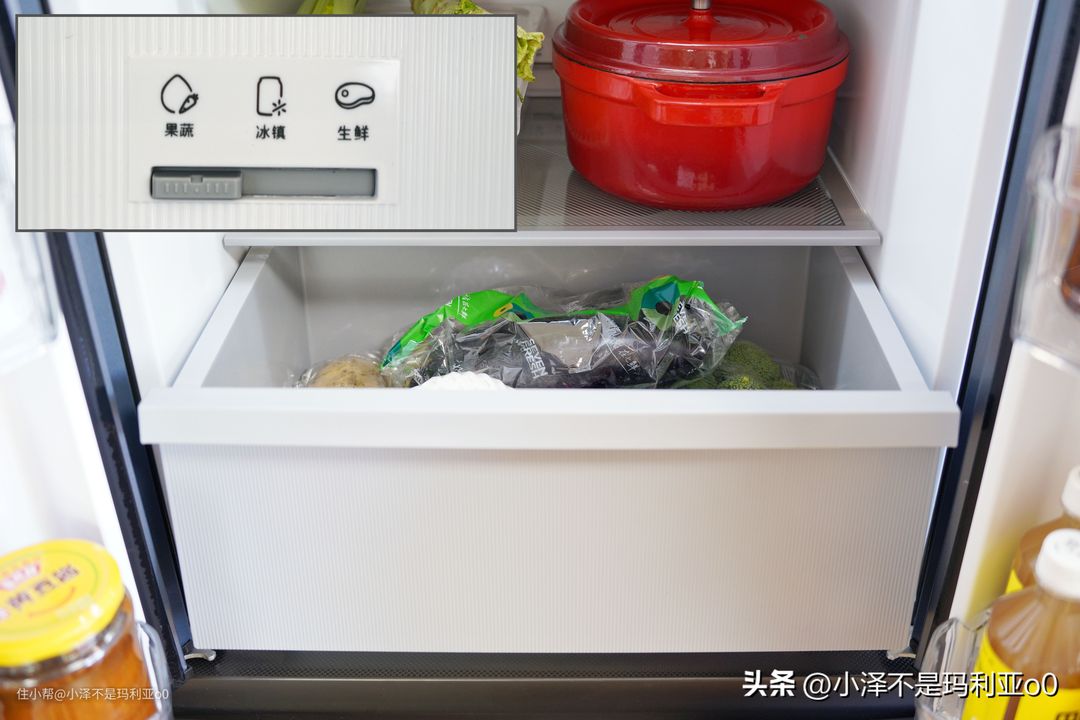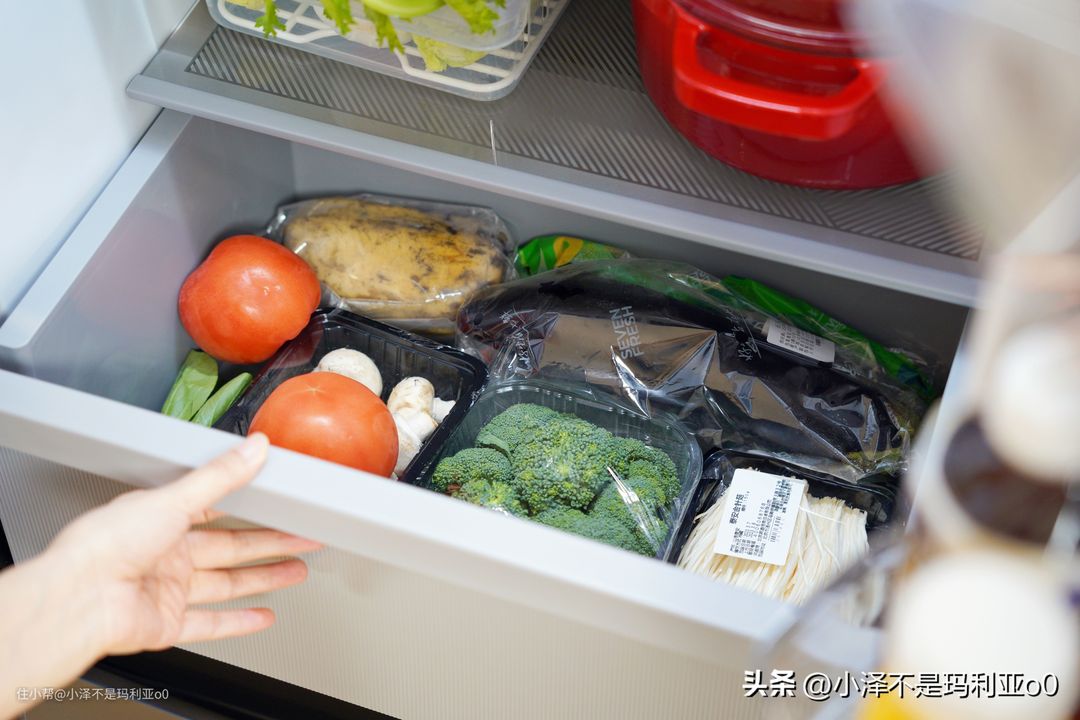 蔬果模式下,这里可以存放老两口一周左右的蔬菜,平时如果懒得去菜市场就能一次性多买点蔬菜存冰箱里。因为进一步隔绝了外面的冷气,避免冷气直吹,所以对延长蔬菜新鲜度有更好的效果。