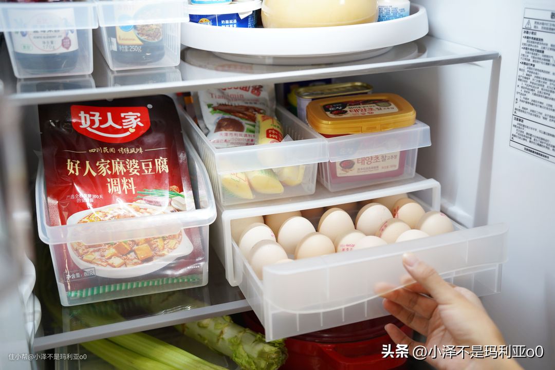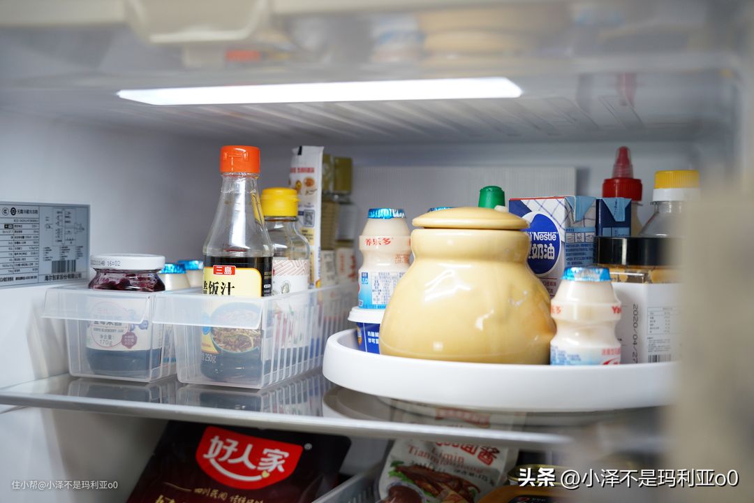 ▼左侧的冰箱门上则摆放上妈妈每天炒菜都会用到的调味料,即使是大瓶的酱油,拿取时也不会碰撞到上方的隔板,这点必须要好评。冰箱门开关也都很顺手,承重也没问题,毕竟是大品牌的东西,做工和质量还是很有保证的。