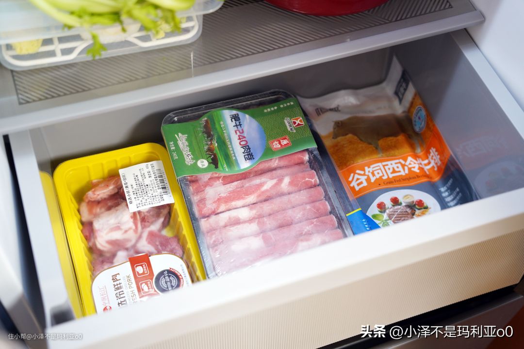 ▼最低下这层则放置老爸囤的各种肉类生鲜,防止生鲜上的细菌污染到熟食,风冷冰箱的冷冻室不会像直冷那样结上厚厚的一层霜,后期也几乎不需要动手去维护,给老两口使用会更加省心。