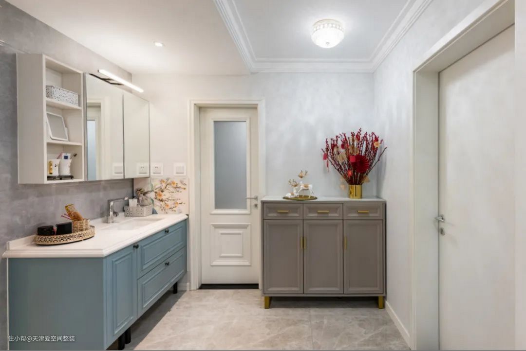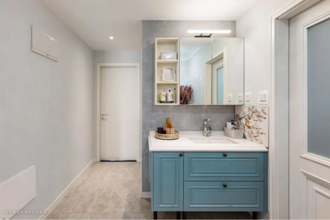 蓝色的洗漱柜将拐角处的空缺填补完整,让空间显得整齐利落。