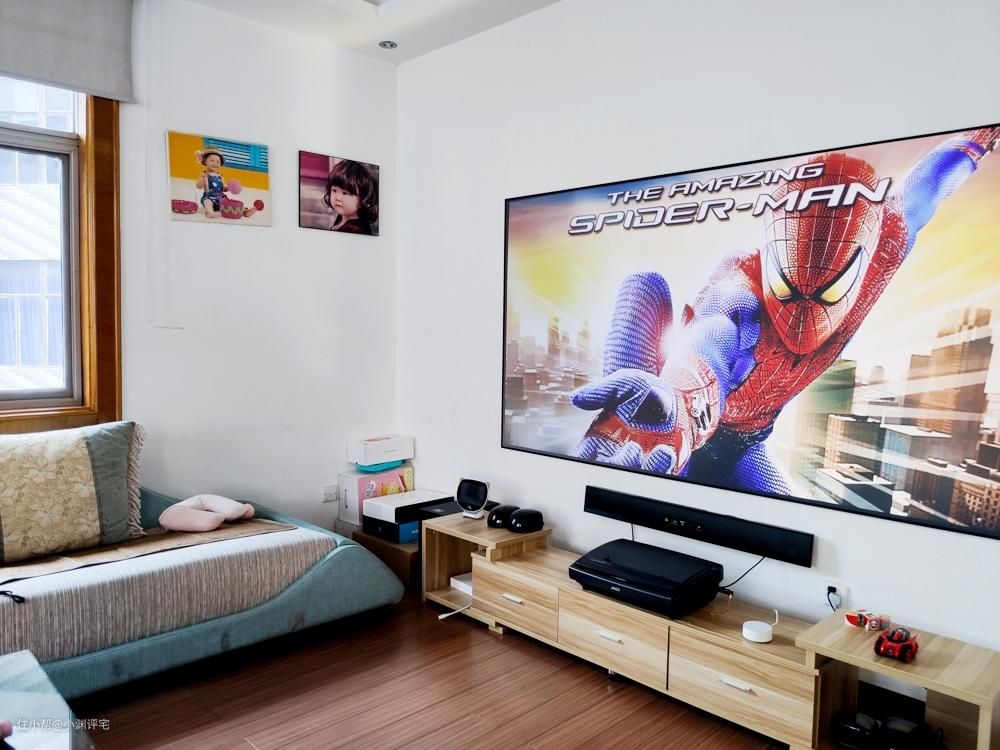 而且相比于投影仪,激光电视的清晰度更高(哪怕是上万元的投影仪,清晰度也比不过激光电视)、尺寸更大。而且激光电视可以直接摆放在电视柜上,不需要像投影仪一样,设备和幕布之间必须拉开一段距离。