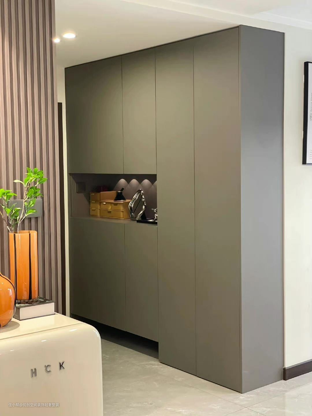 入户玄关的设计灰色的玄关柜低调内敛,空间更加有纵深感,悬空的位置放日常穿换的鞋子中间的壁龛可以放钥匙和各种随后放置的杂物。