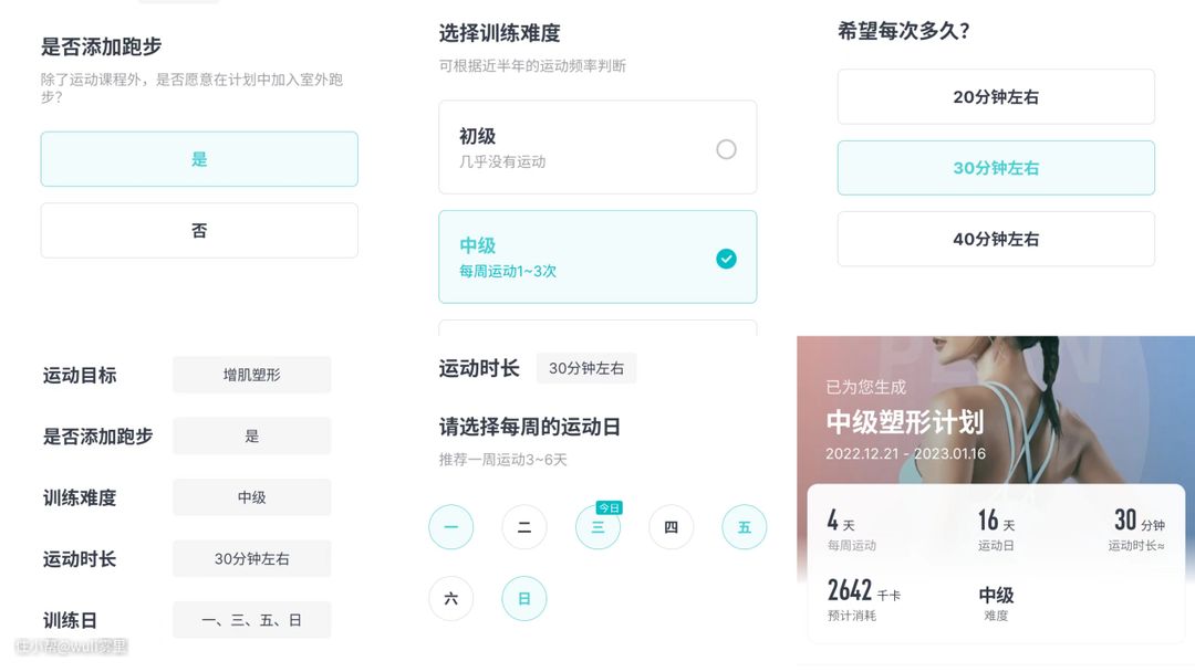 体脂处于正常范畴想要塑性或提升肌肉含量的小白可以直接无脑跟着AI推荐的课程走,既不算特别累又能看见效果。 像我春夏秋都有慢跑的习惯,有一定的运动基础,也不抵触户外跑步,AI就在给我打造运动计划时考虑进去了,运动强度配置了中强度。