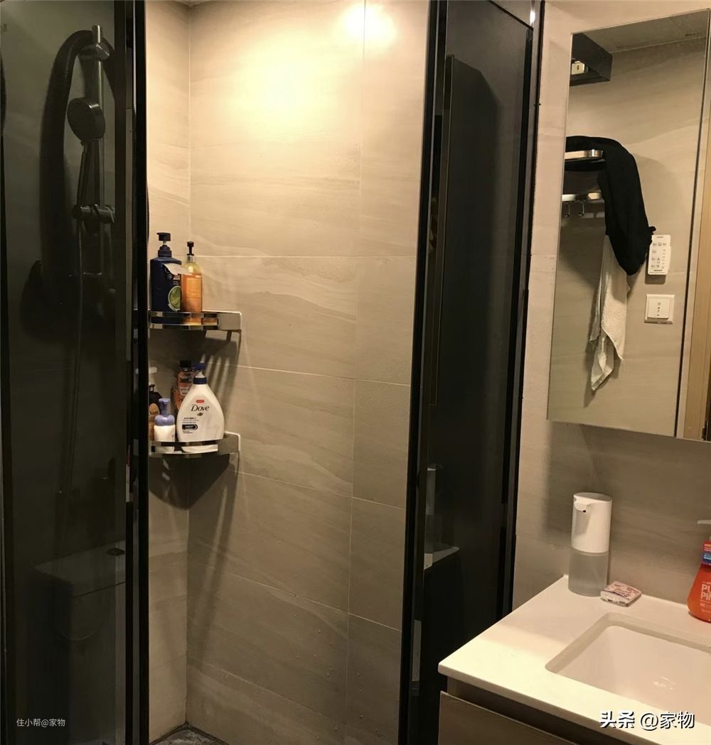 为了省钱,卫生间内的原有装修并没有改变,一进门就是个镜柜,蹲便马桶和浴室则用黑色的浴屏进行分隔,放在了里面的小空间中,说起来虽然狭小,但洗漱、沐浴、如厕功能也都有。