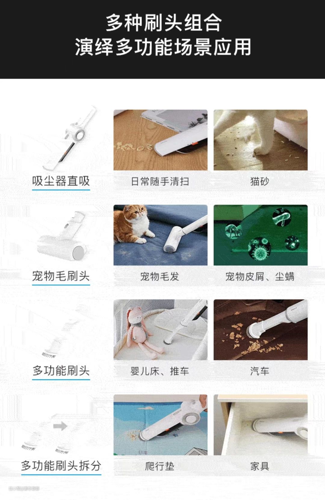 - 多样吸头配件切换,清洁一应俱全