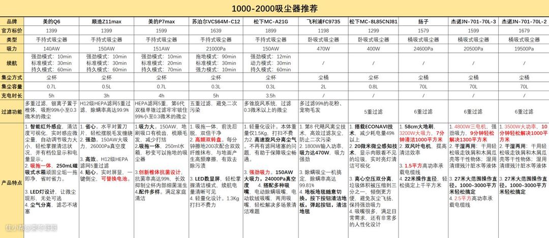 所以为了解决宝子们的疑问,我又开始搜罗了大量100-2000元的吸尘器商品的资料,通过对比和观察,筛选出了十款性价比高的吸尘器,而且和之前一样,手持式,卧吸式,桶吸式吸尘器都有。