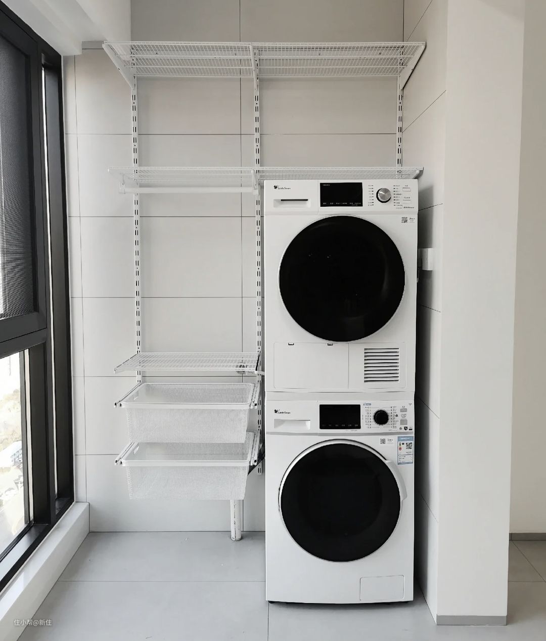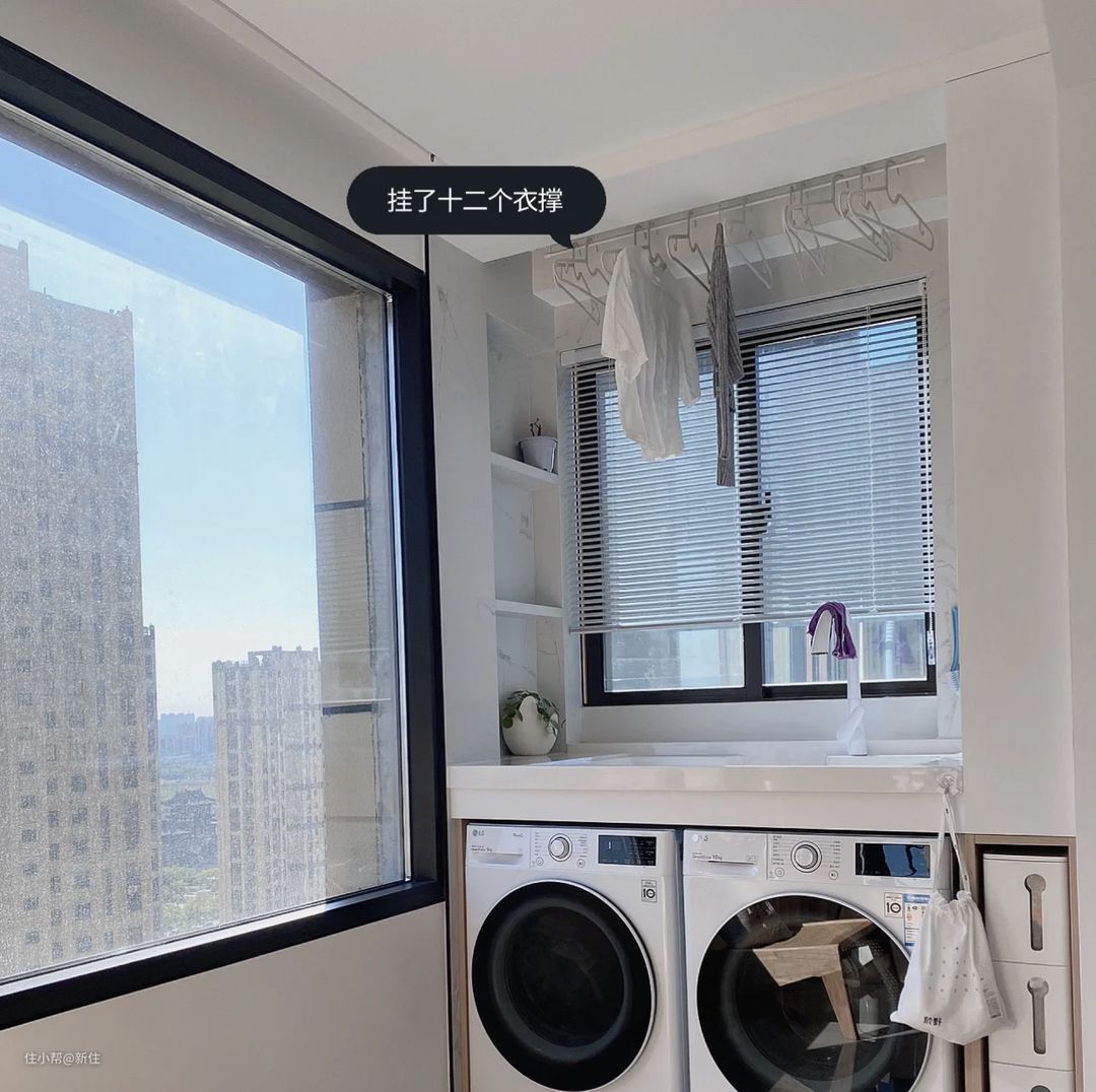 最后,肯定会有人觉得:洗衣区搞这么多有的、没的,又是壁挂收纳、又是顶部的晾衣架、又是壁挂洗衣机、扫地一体机的……一定会很乱吧。