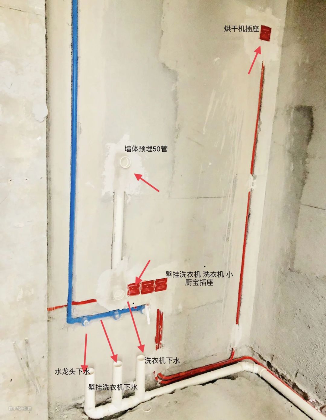 若选定的是壁挂洗衣机,要得装得好看,未来不裸露管线,还需要提前预埋一个pvc50管。