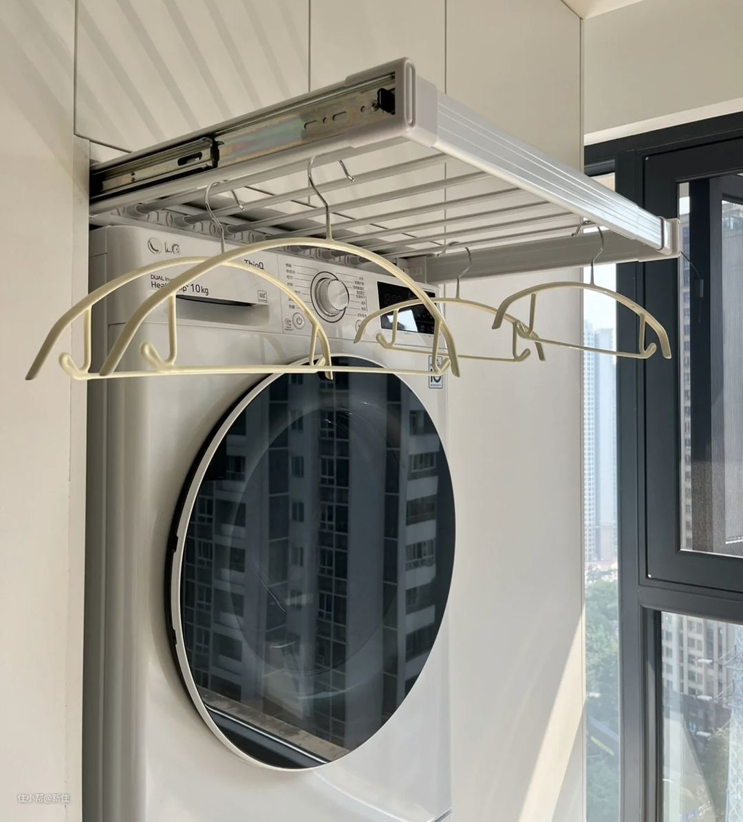 当遇到这种上面是半窗的,还可以给顶面加装晾衣架,来给晾晒区扩容。