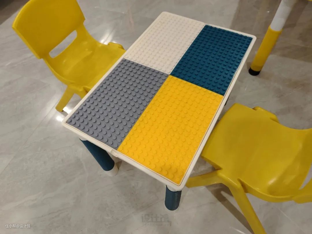 此外,还可以摆上小玩具桌,比如小乐高桌,让孩子坐在小玩具桌上玩玩具、拼积木。