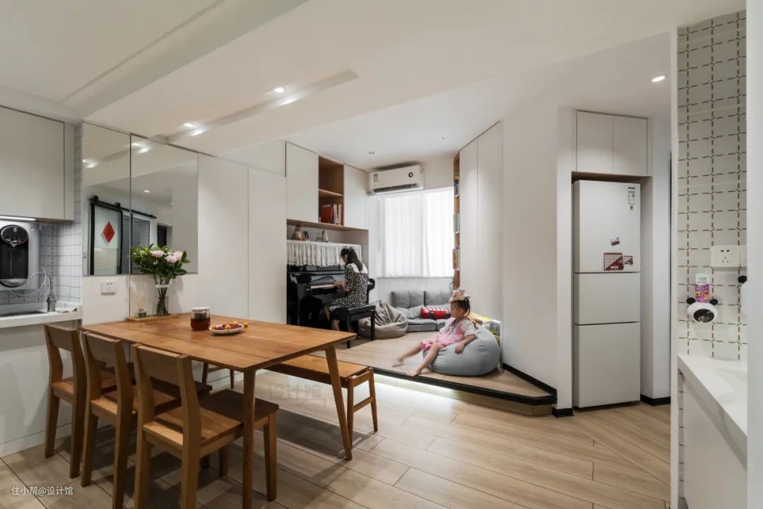 忘掉客厅的概念,把客厅与餐厅做成一体的设计,做到真正的「去客厅化」,如下图是我们改造过的一套小户型,就是真正的没有客厅的设计,却也住得舒适——客人来了,大人坐在餐桌喝茶聊天,小孩在旁边三角区玩耍,其乐融融。
