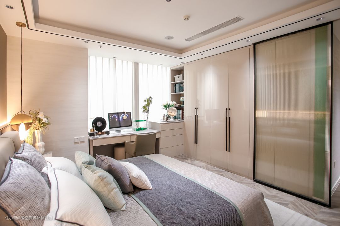 卧室的照明是无主灯设计,没有设置大功率的主灯,而是在顶面分散安装嵌入式筒灯。