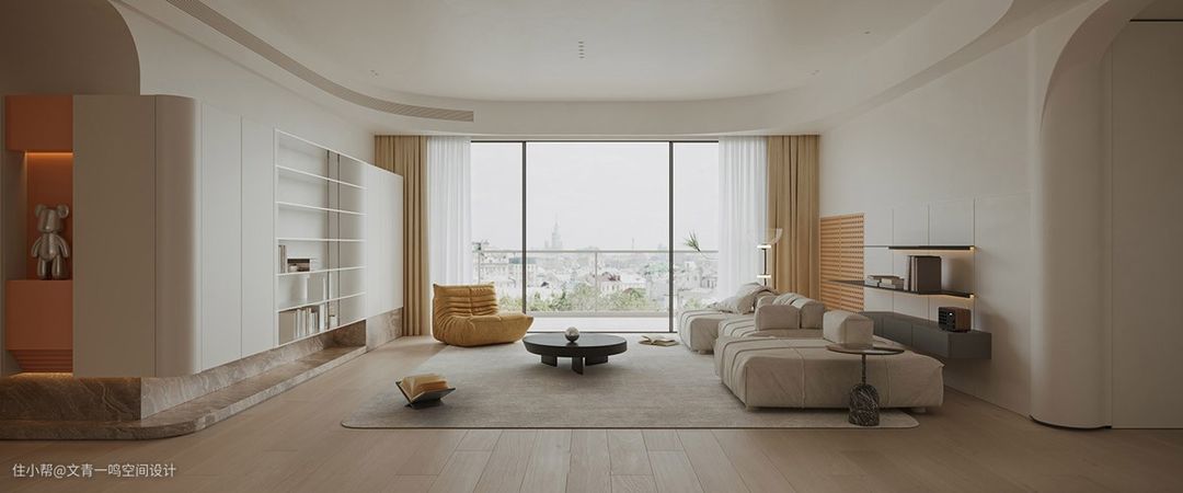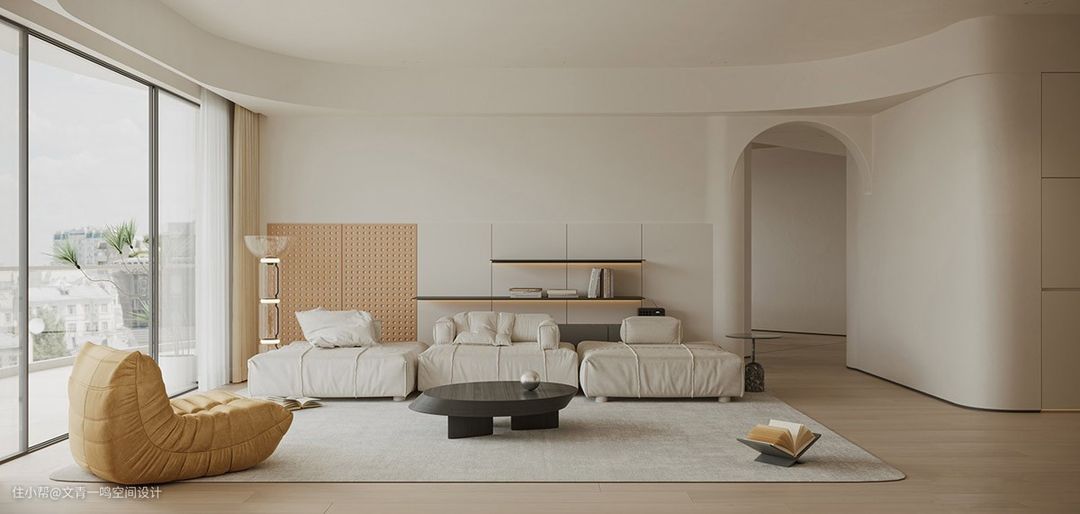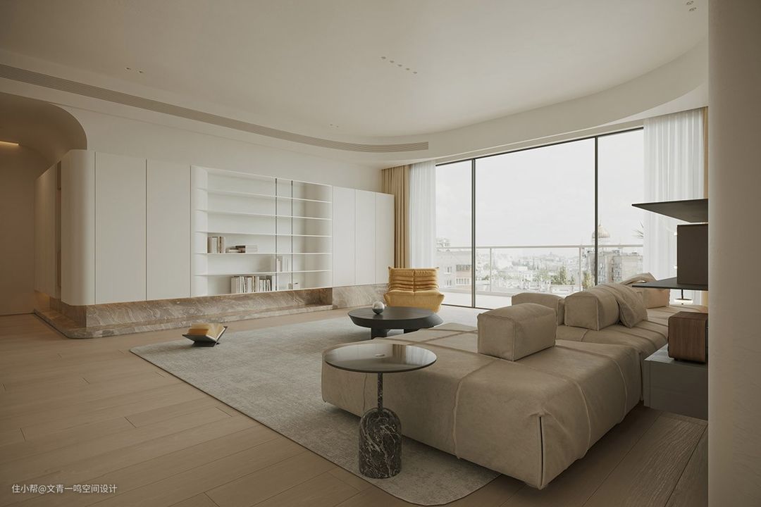 宽敞且光线充足的客厅具有平滑弯曲的墙壁细节和优雅的拱门。储物家具整齐地包裹起居室的曲线轮廓,休闲家具简约而现代,轮廓柔和。白色大理石元素带来奢华时刻,而天然木材色调则营造出柔和的视觉温暖感。