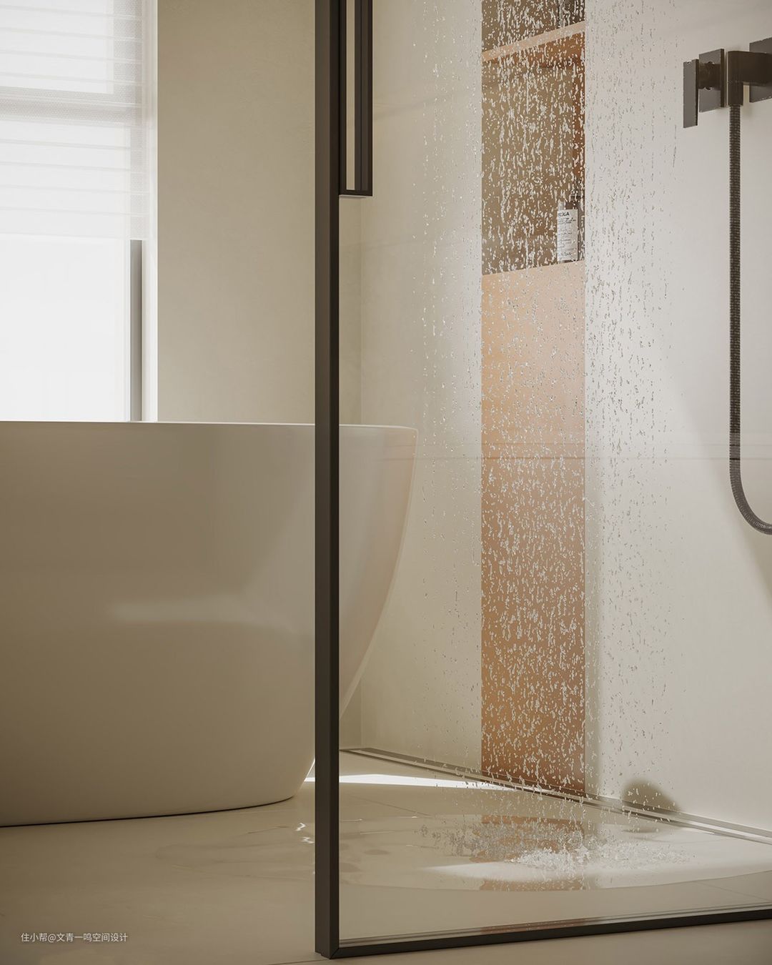 黑框淋浴屏将水槽区与潮湿区隔开,潮湿区包括窗户旁边的独立浴缸。