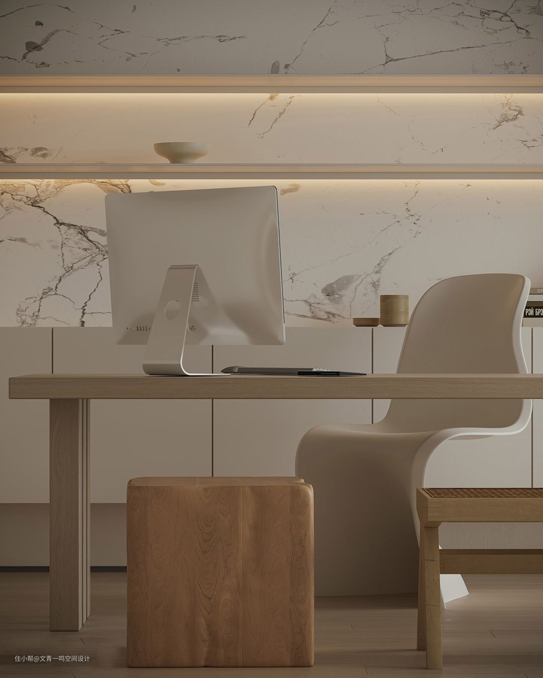 壁架上装饰着最小的装饰,大理石纹路提供了所有的趣味。一张现代办公桌在前面突出,采用舒缓的浅色木纹。木凳在简约办公桌的一侧提供,而曲线优美的办公桌椅则在命令中拉起。
