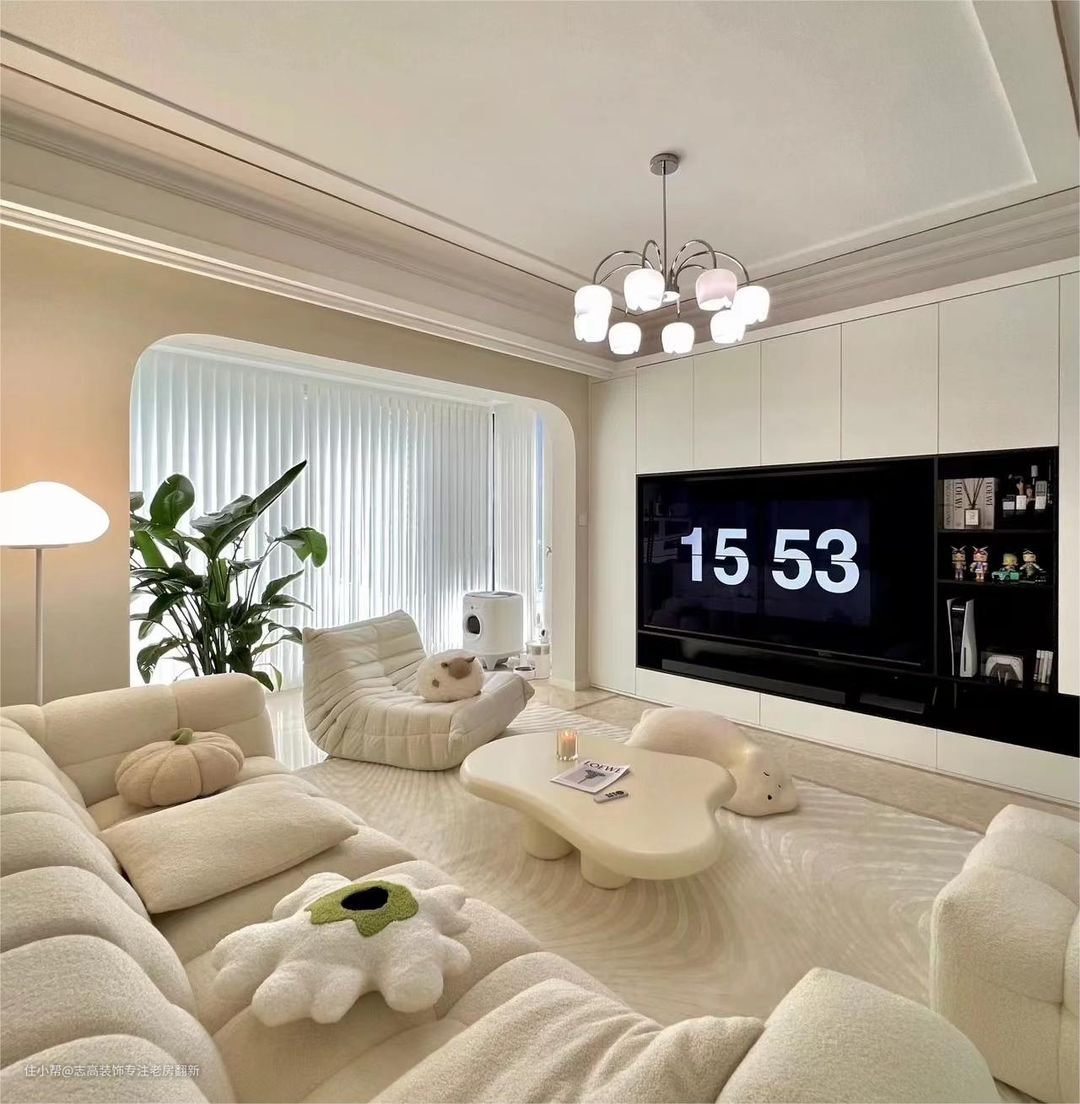 奶油风打造的是纯欲的氛围,用两个字形容是“呆萌”。看奶油风的垭口、硬装造型都是要挂圆处理的,沙发都是选择又圆又胖又可爱类型,单椅也要选择类似于弧形或者圆形的。