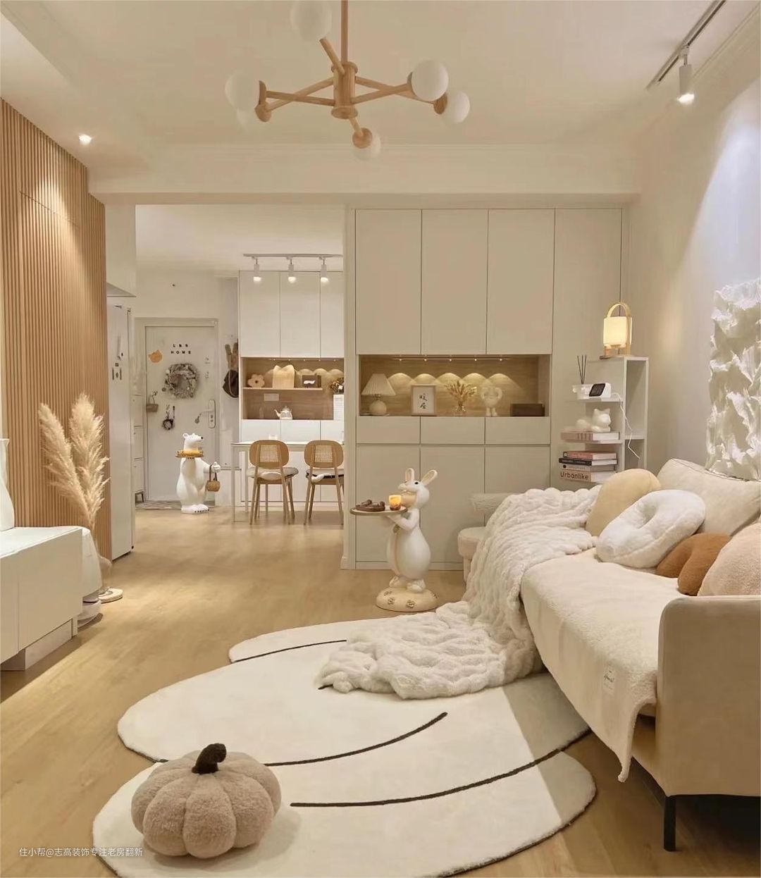 奶油风一定要做平顶、做无主灯的设计,墙顶一体。筒灯、射灯尽量不要突出顶面,任何的突兀都会打乱奶油风的柔美,可以用圆形的石膏灯或者月球灯做灯光的造型。奶油风比较依赖线性照明,大面积的纯色色块是需要灯光氛围来烘托的。