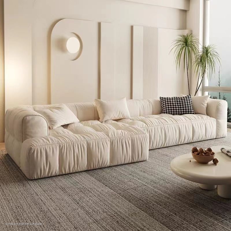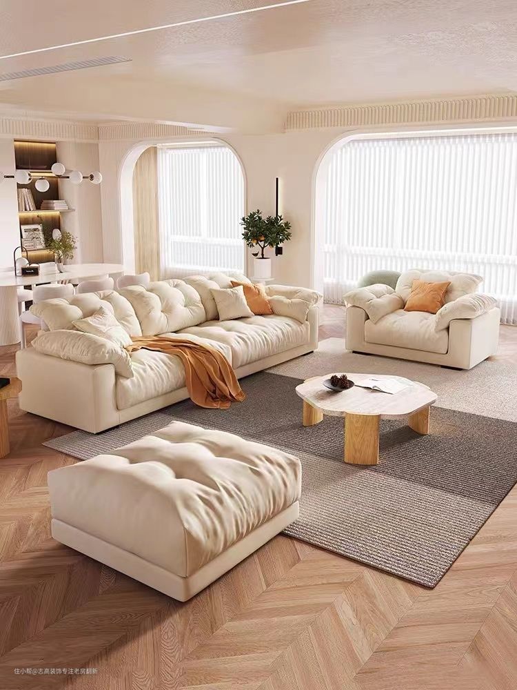 软装选择奶油风的前景色和背景色,也就是家具和墙面不是靠颜色对比去做出层次感,而是靠同色系的深浅、明度、材质的不同来做区分。沙发的材质都一般以羊羔绒、珊瑚绒、灯芯绒和亚麻为主,柔软舒适。