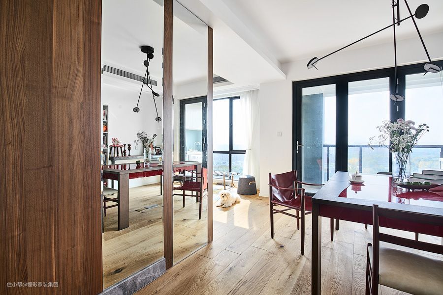 • 茶室区在核心区域摆放了一张红色大长桌扩展长度,颜色耐看又张扬提升了客厅颜值;