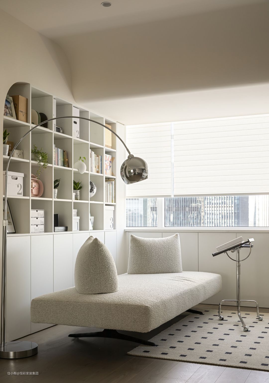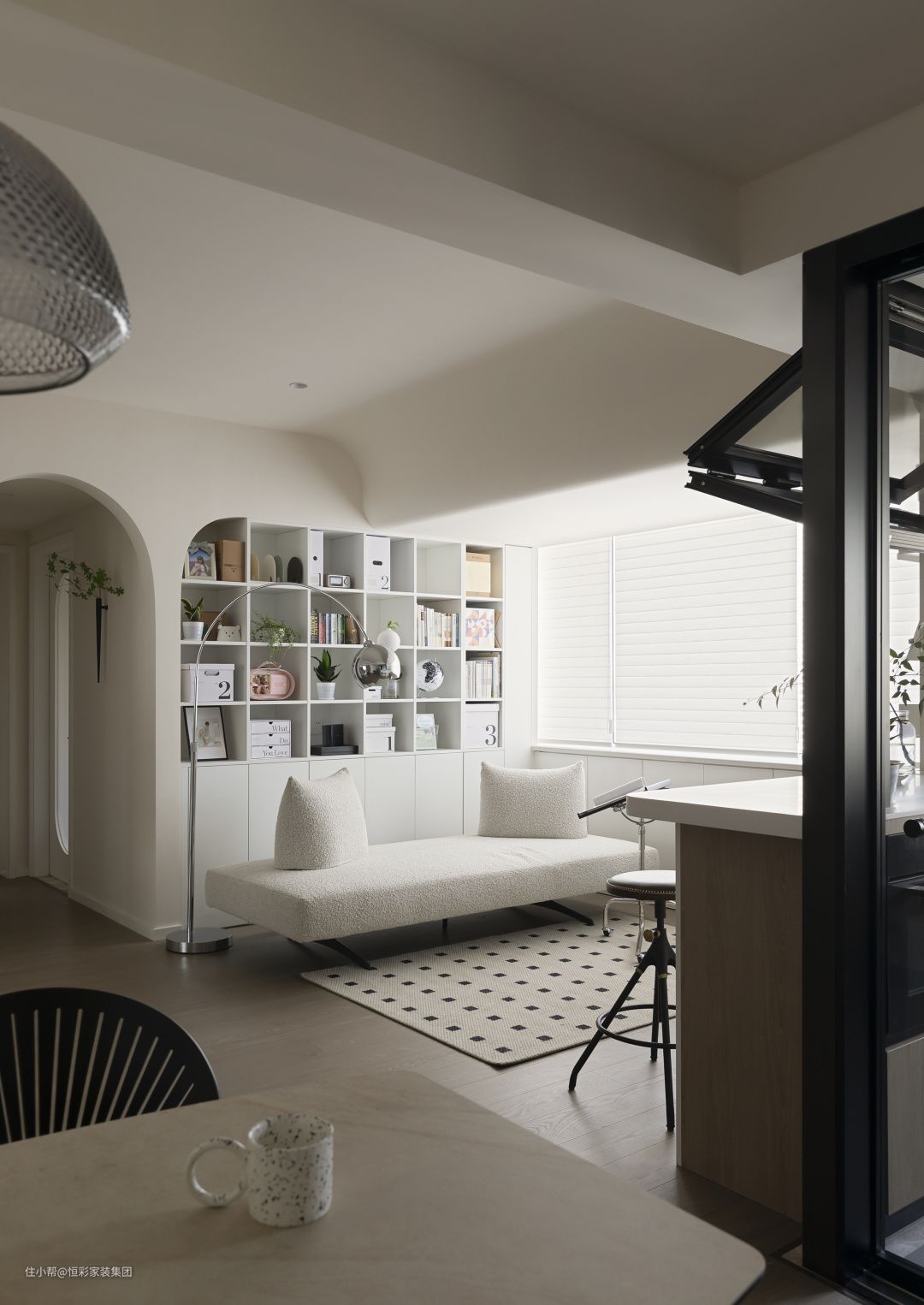 • 利用客厅靠墙空间做了整面书柜用于放置藏书,百叶窗帘横向遮光,半透光效果不错,给屋主的日常阅读提供了优秀的采光条件;