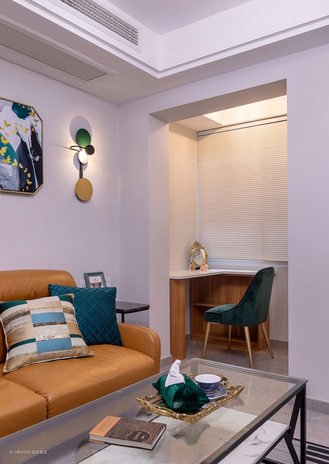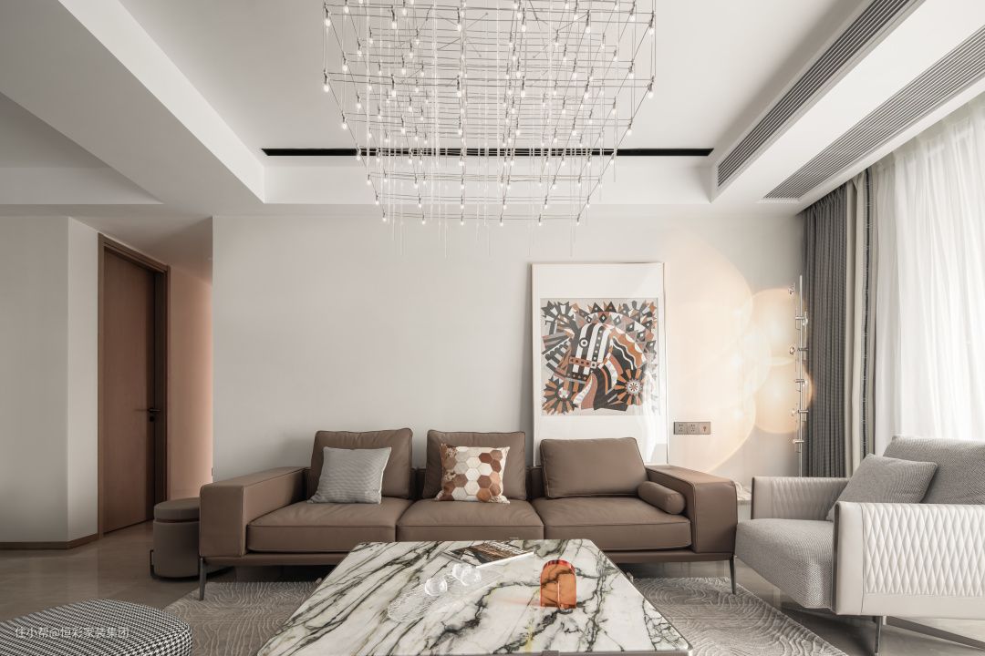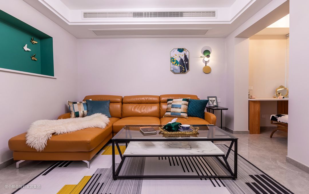 • 主沙发选择棕色真皮沙发,装饰画选择爱马仕的丝巾靠画,画中的一抹橙色和局部的深棕色与主沙发的颜色相融合,满满的轻奢质感;