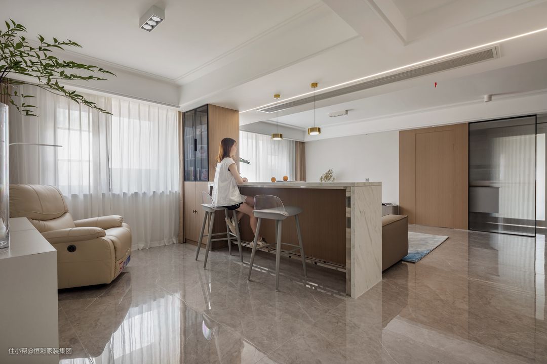 • 客厅无主灯设计,避免压低层高,沙发背靠半高吧台,原本不错的采光进一步提升,空间通透敞亮,视觉更显开阔;