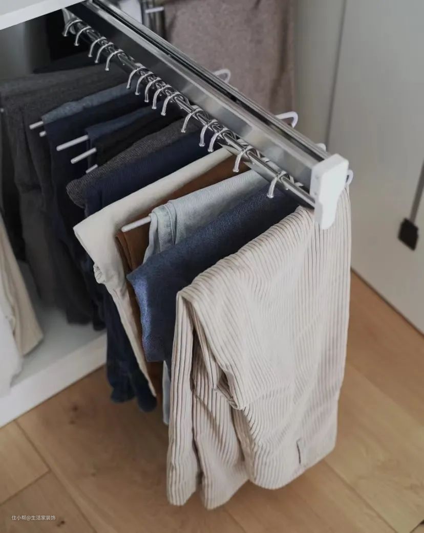 还有的衣柜宽度不够,要想存放下大量的衣物,也可以选择抽拉式衣架,挂衣服、裤子都可以。