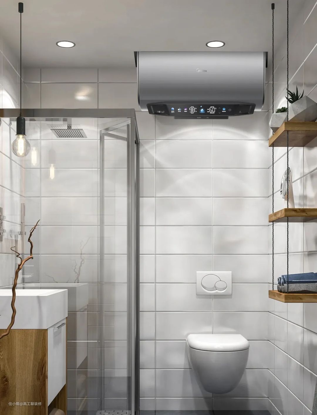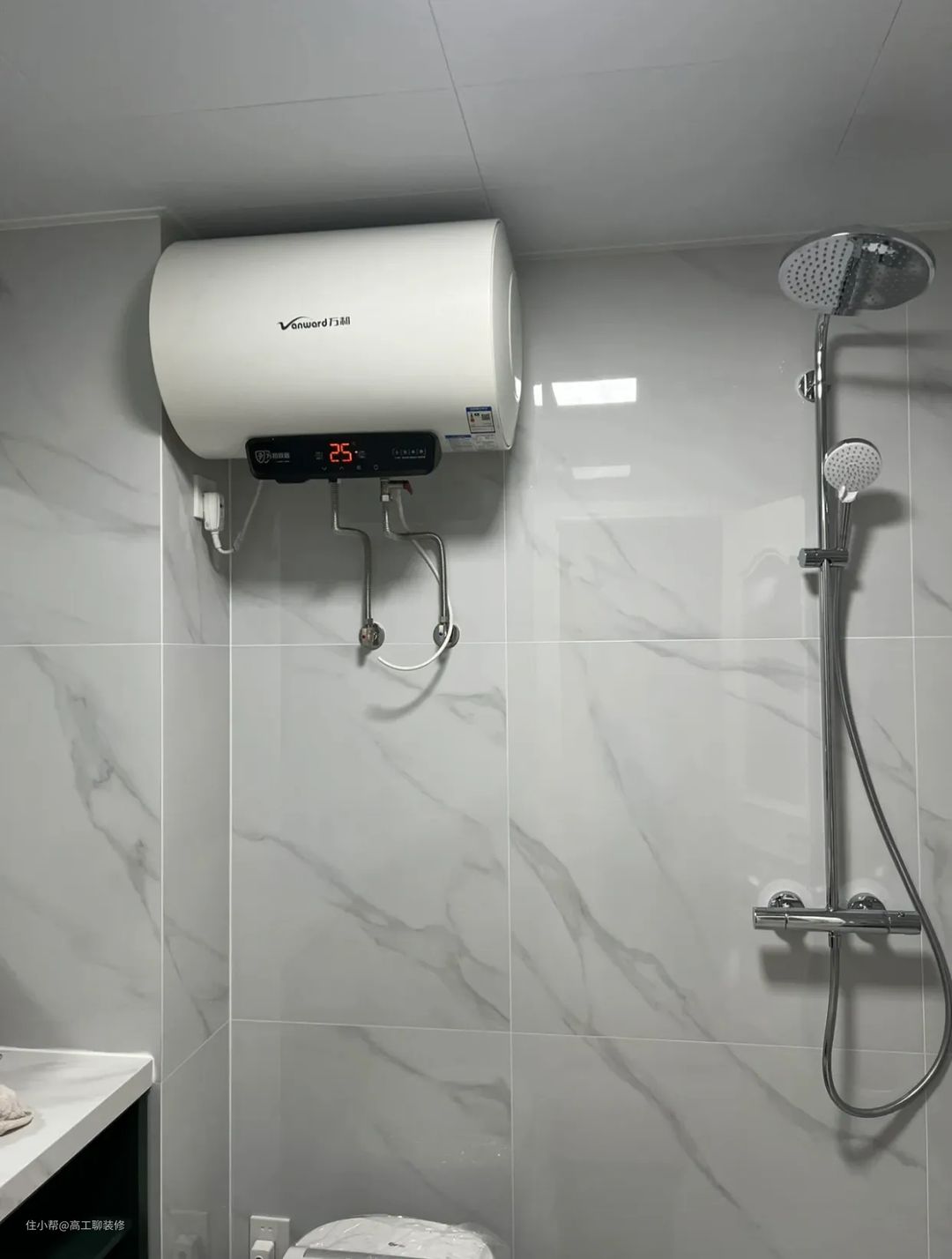 电热水器安装在马桶上方,我们要衡量浴室柜和热水器的尺寸问题。