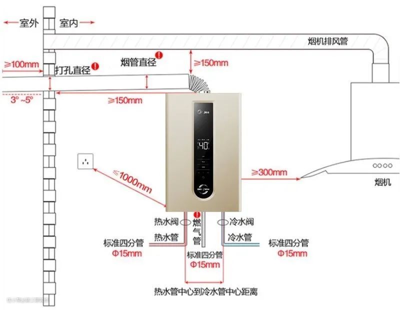 安装注意事项:燃气热水器常安装在厨房和阳台,重点要考虑预留的安装位置尺寸是否足够。