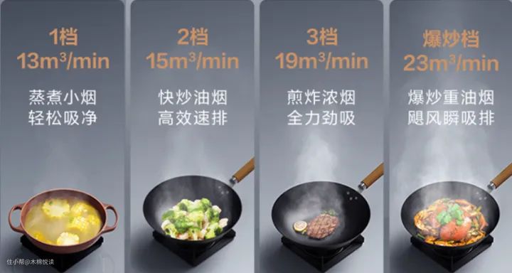 最大风量23m³/min,可根据烹饪情况选择适合的档位,爆炒大油烟也不怕;