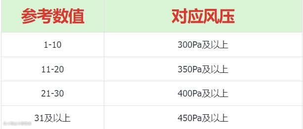 举例说明:总楼层30,家住8层,参考数值=30-8=22,对应最低400Pa风压。