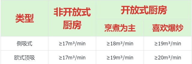 一般家庭厨房面积为3-5平方、5-7平方、7-9平方和10平方以上,还要区分封闭式和开放式两种样式,风量选择可以参考下面数据。