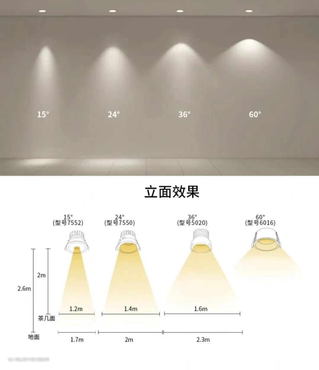 射灯(聚光):灯光比较聚,立面灯光上墙有明显清晰的光弧,一般有反光杯和透境两种。