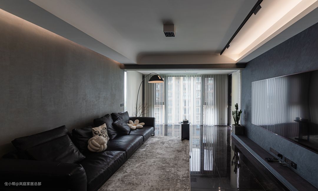 吊顶做了凹槽设计,无主灯设计不压层高。两侧安装隐藏式的灯带,再加入吸顶灯和轨道射灯做辅助照明,让温暖治愈的暖光将黑灰色的暗沉压下,就像是黑暗中点亮的火把,照亮前方的路。
