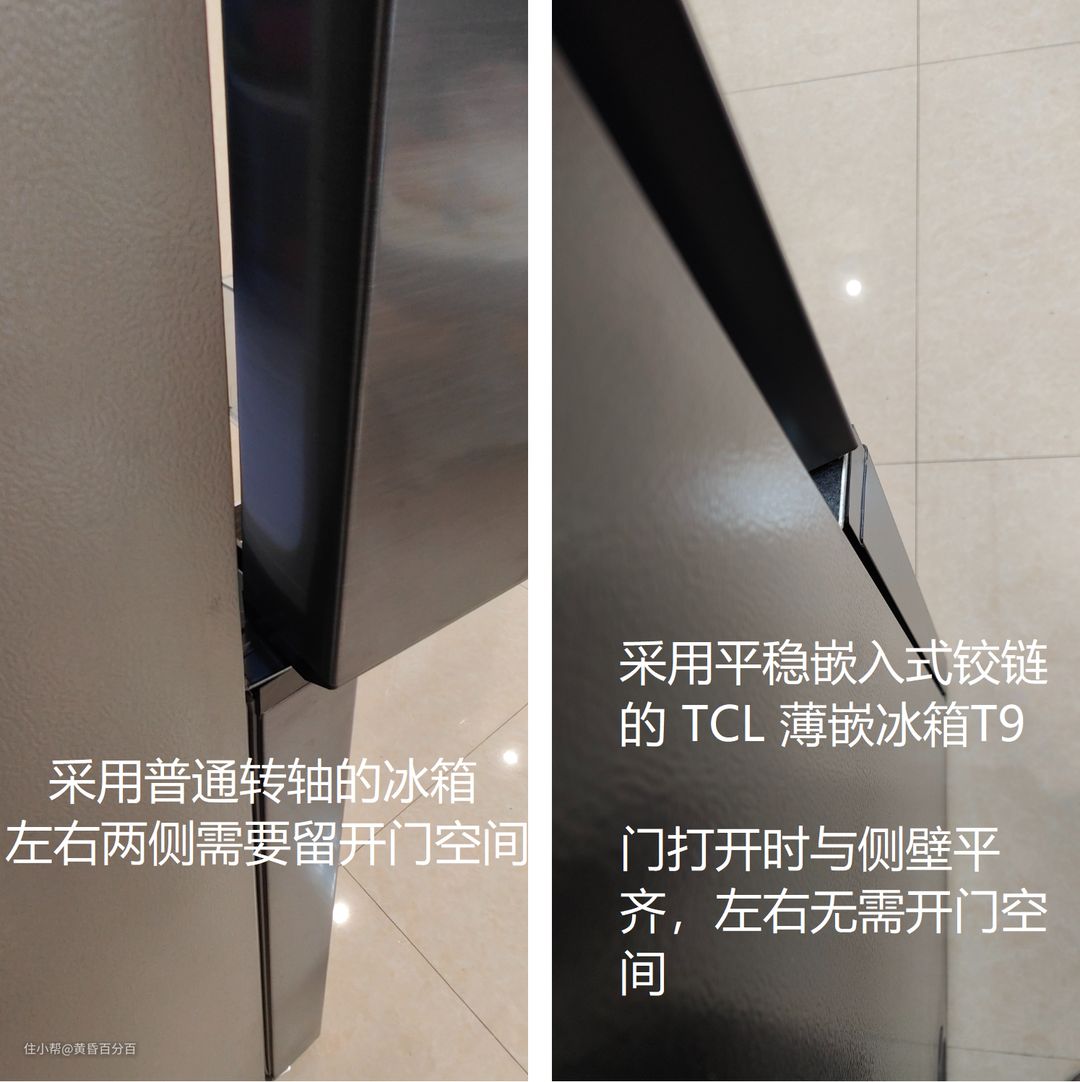 ▲而像TCL超薄零嵌冰箱T9这样采用平稳嵌入式铰链的冰箱,在开门时不需要额外的空间,可以做到贴墙开门,冰箱内的抽屉也可自在取出,因此冰箱可以与橱柜位于同一水平面,且左右两侧均无需留置空间,做到真正的纯平式嵌入。